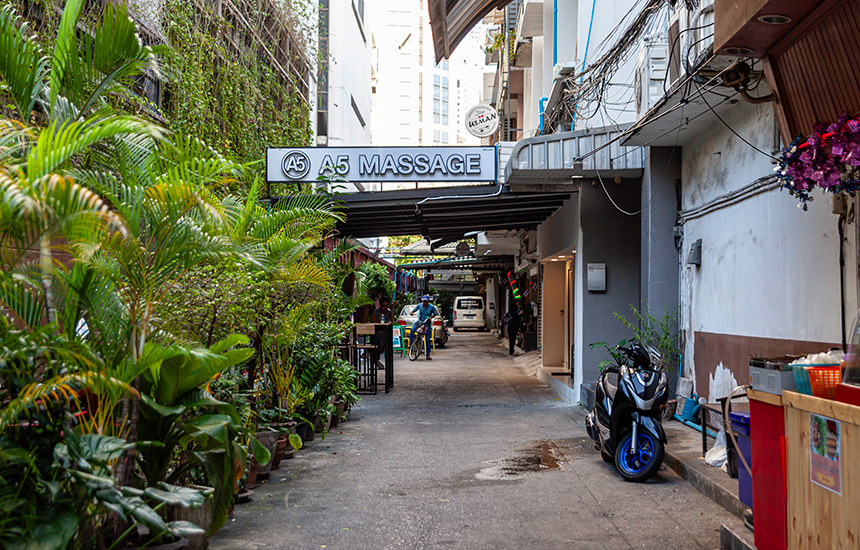 体験日当日。BTSプロンポン駅から徒歩でお店に向かう。今日も相変わらずいい天気。まさに体験日和。スクンビット通りをアソーク方面に向かって徒歩5分ほど。スクンビット・ソイ22に到着。道すがら2023年末にオープンしたばかりのモール「EMSPHERE / エムスフィア」は今だに観光客で賑わっていた。ちなみに、モールの中を通り抜けてスクンビット・ソイ22に行くと若干のショートカットになるので覚えておいて欲しい。エアコンが効いているモールの中を通るので汗もかかないし、食事も済ませられるので一石二鳥だ。さてスクンビット・ソイ22の活気ある通りを5分ほど進んで「A5 Massage」がある小道に到着。小道の入口には親切に看板が備え付けられているので迷うことはないと思う。胸の高なりと興奮を抑えながらお店へ。