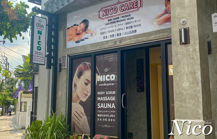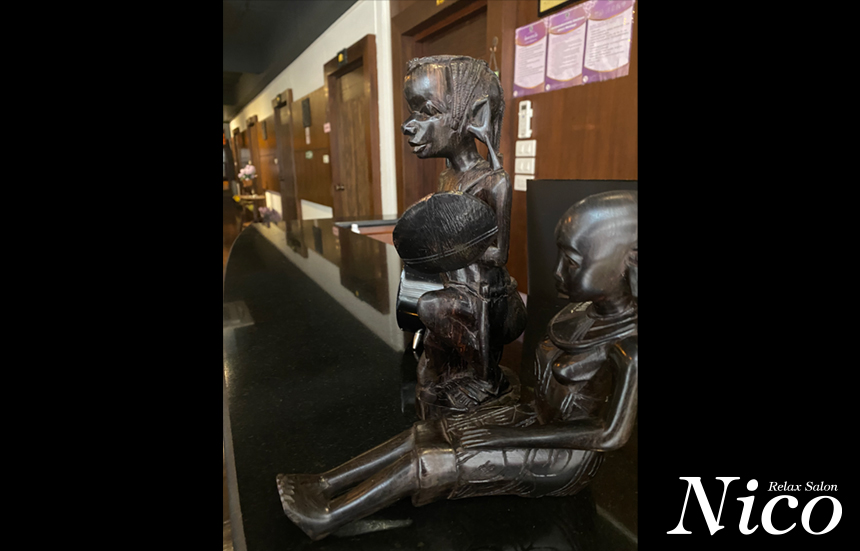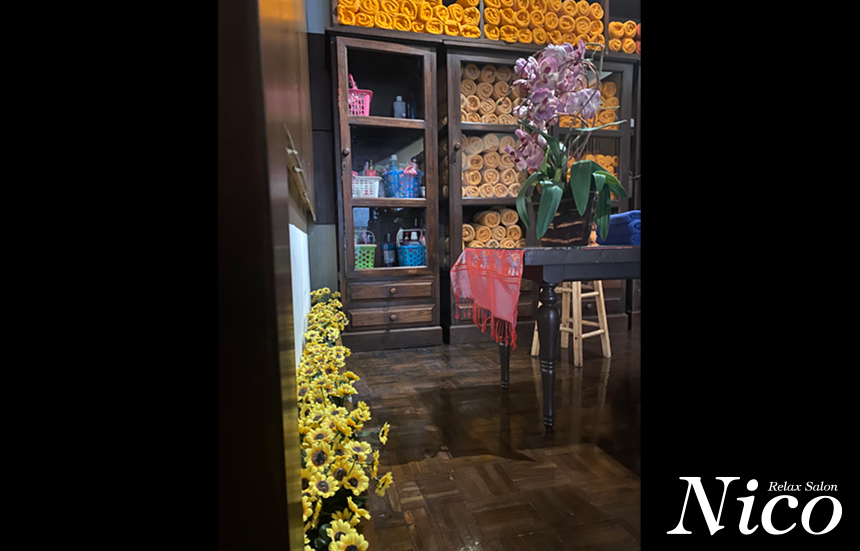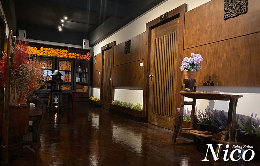 アソーク交差点にそっとたたずむ癒やしの空間「Nico Relax Salon」。店内は木の香りに包まれ、タイらしさと上品さがとけあう静かでラグジュアリーな空間です。